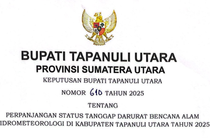 Bupati Tapanuli Utara telah menerbitkan Keputusan Bupati Tapanuli Utara Nomor 610 Tahun 2025 tentang Perpanjangan Status Tanggap Darurat Bencana Alam Hidrometeorologi di Kabupaten Tapanuli Utara Tahun 2025.